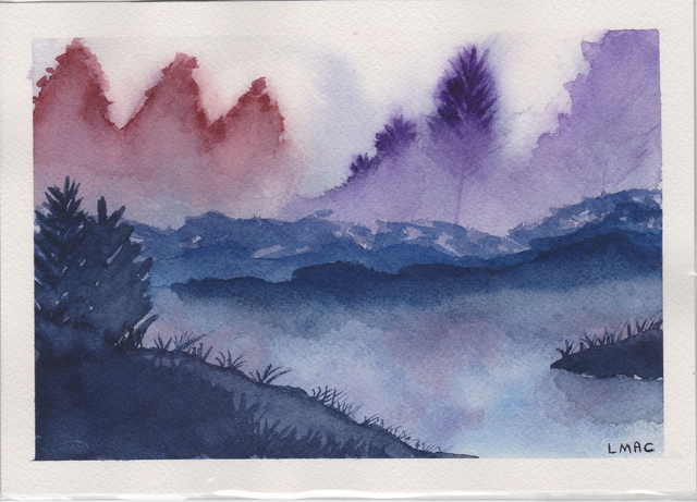 Aquarelle représentant un étang sous la brume.